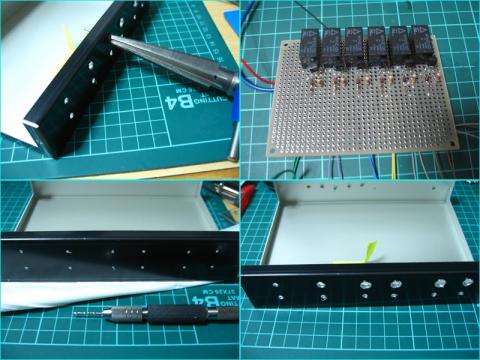 ケース加工は時間が掛かりました 穴あけ道具が無いので手漕ぎは疲れます ドリルとリーマーでスイッチが取り付けられる穴に加工しました 前部12個+後部が10個+底面も4個 もう大変...アルミですが。