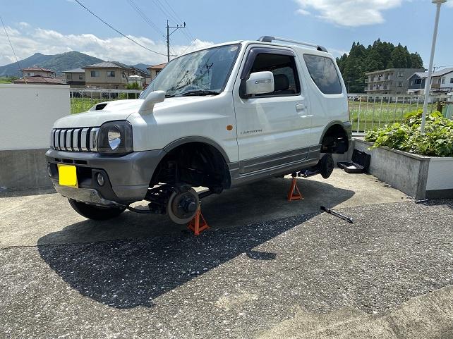 車体を油圧ジャッキでシャカシャカ上げてーの、具合の良いポイントを見つけてスタンドをセット、ゆっくり油圧を抜けば、じわじわスタンドに下がって車は浮いたままになります。