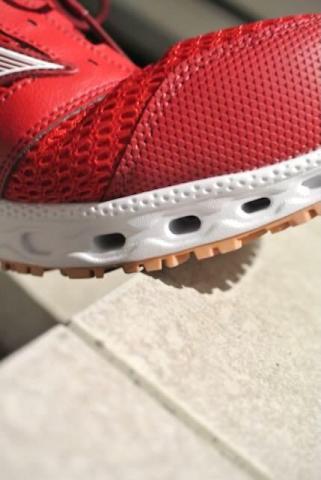アッパーの大胆なメッシュ使いと、ソール側面の8つの通気孔によってシューズ内の熱気を逃し、足元を快適にキープ。
