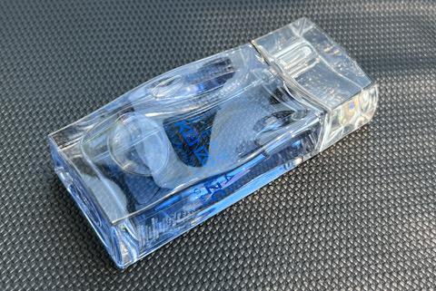 個性的なカタチの透き通るような透明感が印象的なガラスボトルの中に淡いブルーの香水が入っていて、水面の揺らぎのような美しさと爽やかさを感じます。