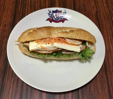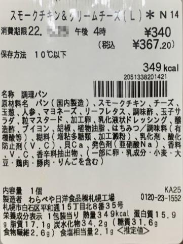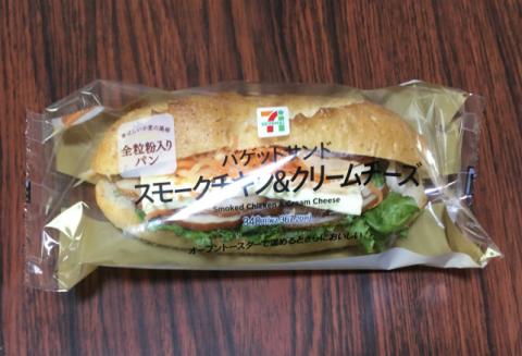 小さめのパゲットに野菜、厚目のクリームチーズとスモークチキンハムらしき物が挟んであります。