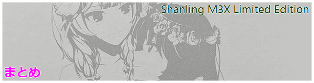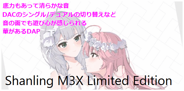 ShanlingのベストセラーハイコスパDAP=M3Xに、イヤホンメーカーTANCHJIMと水月雨(Moondrop)の公式キャラクター浅野天琪ちゃんと水月ゆきちゃんをあしらった美麗な外装や専用ケース、限定音源を仕込んだ1500台限定のレア百合DAP、Shanling M3X Limited Edition。アイテムとしてかなりレアで、所有欲を満たすものだったが、DAPとしての基礎性能も優れていて、ちょうど、バッテリーが弱ってきていたそれまでのメインDAPONKYO DP-X1Aの代替を探していた自分にとっては、価格的にも性能的にも満足できるDAPだった。