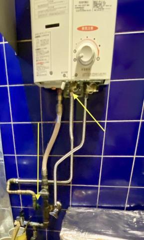 写真内黄色い矢印(上)から出る水が、矢印(下)に向けて流れるのですが、