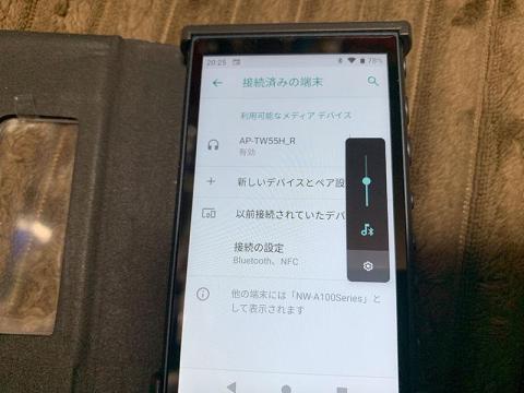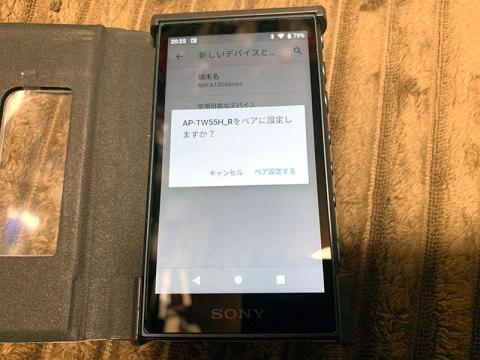 接続設定は充電器からイヤフォンを取り出し、数秒後にNW-A105HNから新しい接続先として表示されたら、「ペア設定する」を実行するだけです。