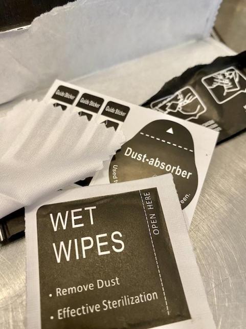 アルコール含有と思われる クリーニングクロスと 気泡押し出し用のクロスが付属