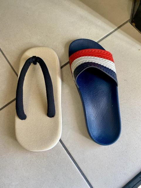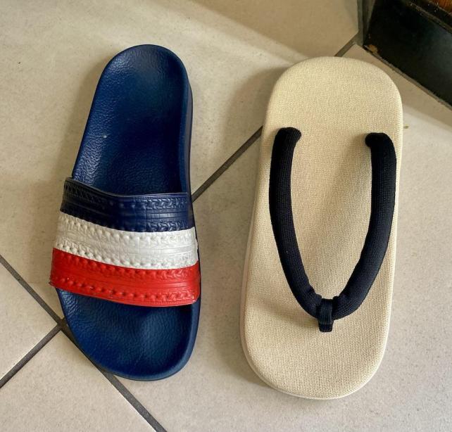 右はイタリア製 ドイツブランドアディダスの フランス国旗柄のサンダル
