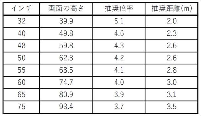 なお、4K TVの設置距離については家電量販店に書いてあるのは高さの2倍の距離と書いてある。