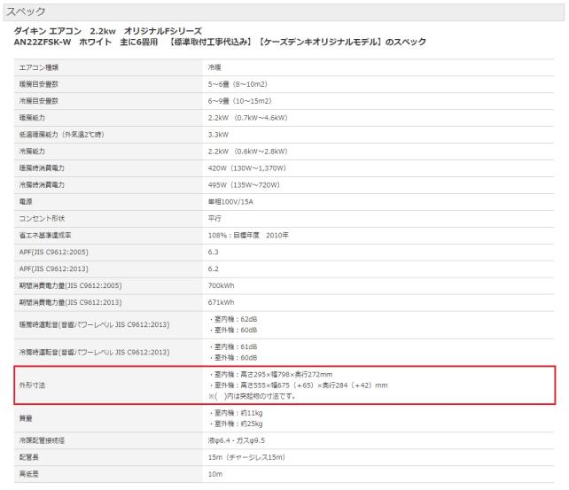 室内機・室外機のサイズですがAN22ZFS-W(通常仕様)、AN22ZFSK-W(ケーズデンキ専売仕様)共に同じサイズとなっています。