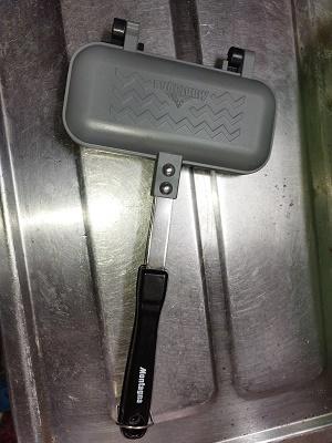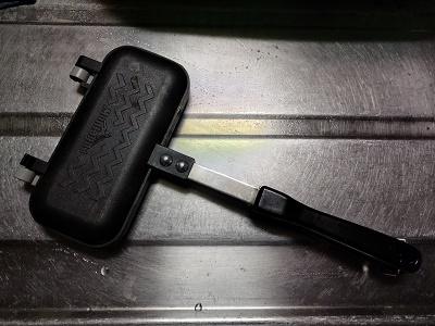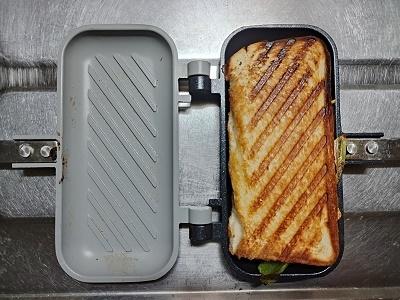 1枚の食パンを2枚折にし、具材を挟んで焼く調理器具です。