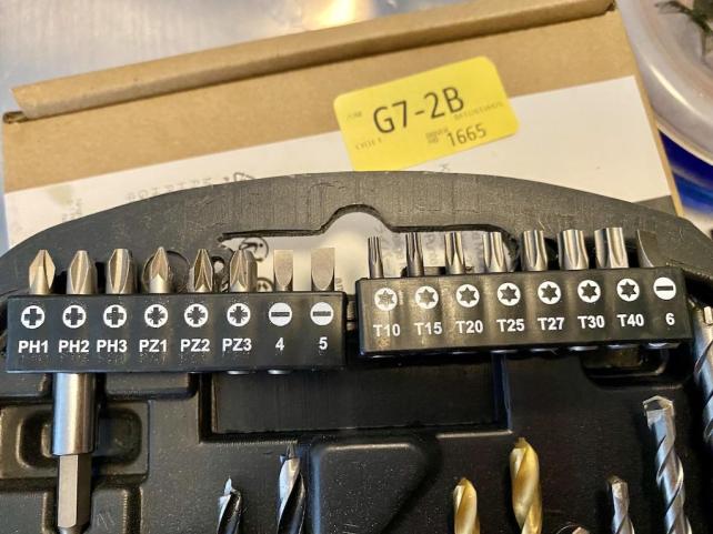 4. 1/4インチ×25mmビット 16個、サイズ:PZ1, PZ2, PZ3, PH1, PH2, PH3, SL4, SL5, SL6, T10, T15, T20, T25, T27, T30, T40.