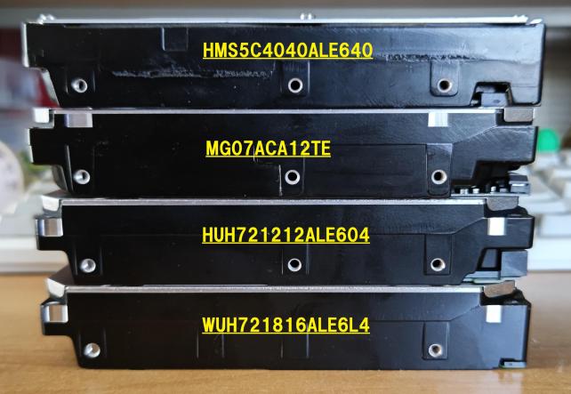 左から順に「HGST HMS5C4040ALE640(4TB)」「東芝 MG07ACA12TE(12TB)」「WD HUH721212ALE604(12TB)」「WD WUH721816ALE6L4(16TB)」です。
