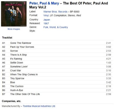 PP&Mのレコードは1960年代にワーナー・ブラザースから発売されました(日本ではW/B東芝)