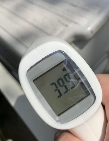 参考までに直射日光が当たり始める午前10時前に室外機の表面温度を測ってみると、その時点で約40℃(その時点での日陰の気温は約31℃)に達していました。当然この室外機は稼働していません。