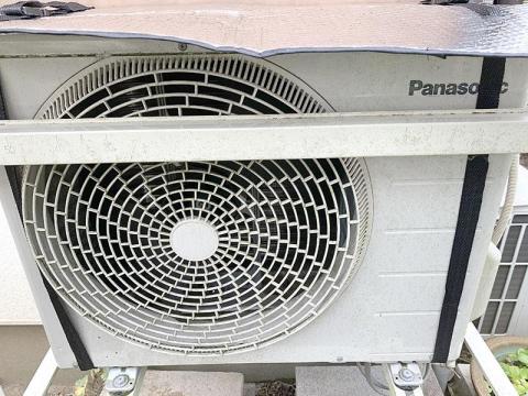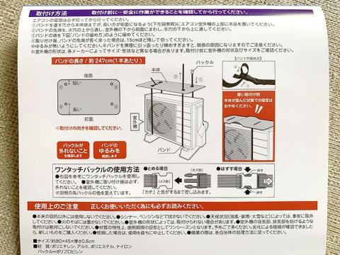 今回取り付けたのはPanasonic CS-GX226Cで、このモデルは小型室外機を採用しているため、バンドの長さはかなり余りました。説明書では余ったバンドは切るように指示されていますが、自宅の室外機は室外機設置用のアングル材を使っていて周囲に枠があるため、強固に固定するために余った部分を枠に結んでいます。こうすれば多少強風などがあっても剥がれにくいでしょうから。