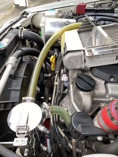 キャッチタンクらサクションパイプへの短いパイプは変色ないままなので液化したオイルがしっかりタンク内に溜ってきていると思われます。ラジエターの横、フロント部分に取り付けたことでタンクも冷やされその効果もあるのかもしれません。