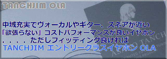 ヴォーカルやメロディ楽器を中心に据えた音造りで好印象を持っているイヤホンメーカー、TANCHJIMのエントリークラスイヤホン、OLA。今までリリースしていた製品群とは、形状が異なり、また価格帯としても群を抜いて低く、今までなかったタイプ・商品性のイヤホン。特にマイク付きのタイプもあるということで、スマホユーザーのカジュアルアップグレードリスニングをターゲットにしたのかな、というイヤホンだったが、