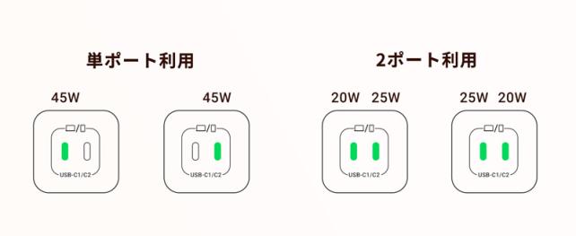 2ポートある、USB Type-C端子に、片方だけ機器を接続した場合は、何れのポートであっても、最大45W出力で充電が可能で、両方のポートに機器を接続すると、どちらかが25W出力、残りが20W出力となり、充電を行うことができます。