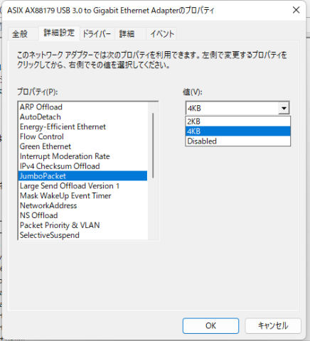 イーサネットコントローラはAX88179でジャンボパケットは4Kまで対応です。