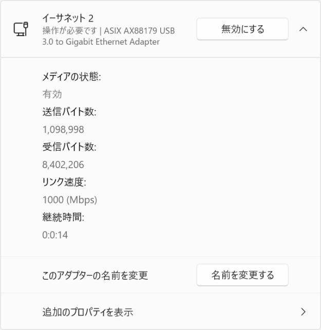 プロパティを見てみると、1000Mbps接続が確認できます。