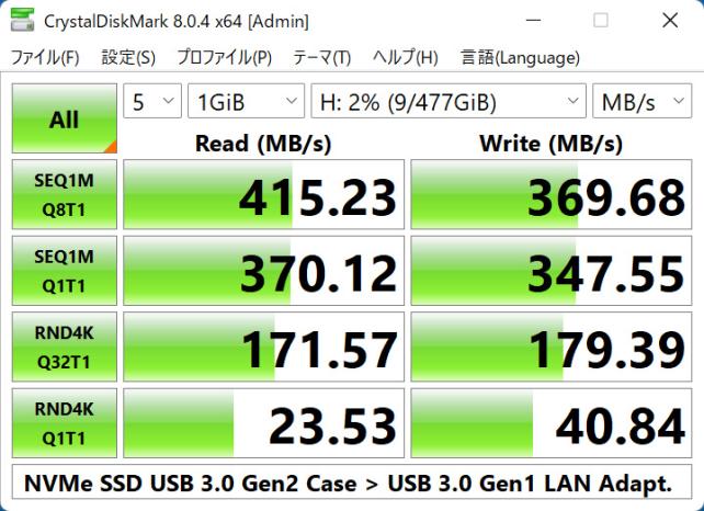 このアダプターを、ノートPCにある、USB 3.1 Gen2(10Gbps) Type-C端子に接続し、イーサネットで比較的大きなコンテンツをダウンロードしながら、LANアダプターに搭載された3つのUSBポートのうちの1つのUSB端子に、NVMe SSDを搭載したポータブルSSD(10Gbps)を接続し、DiskMarkを走らせてみました。