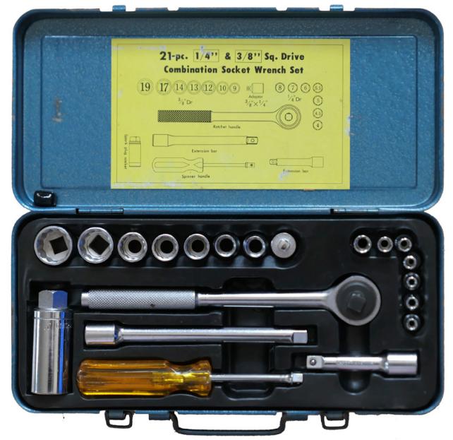 私が普段使っているラチェットレンチ工具は、3/8インチ仕様で、付属で3/8インチ >1/4インチ変換ツールと3/8用ビットと1/4用ビット,スパークプラグ用ビット,2種の延長バー,手回し用ハンドルが付いています。