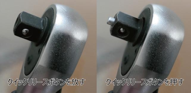 ビットを外す際には、ラチェット部のスライドノブ上部のボタンを押すことで、ビットを固定しているサイドピンが引っ込み、外すことができます。