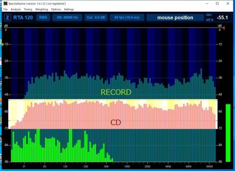 下画像は竹内まりや曲「告白」をCD再生と、レコード再生時の曲終わりまでのレベルの履歴を表示したものです ご覧のようにレコードは再生レベルの強弱がCDより大きいです カートリッジやアンプ、CDプレーヤーの差異もありますので参考程度にお願いします CDはややフラットな感じはしますがレコードは高域が上がっています。