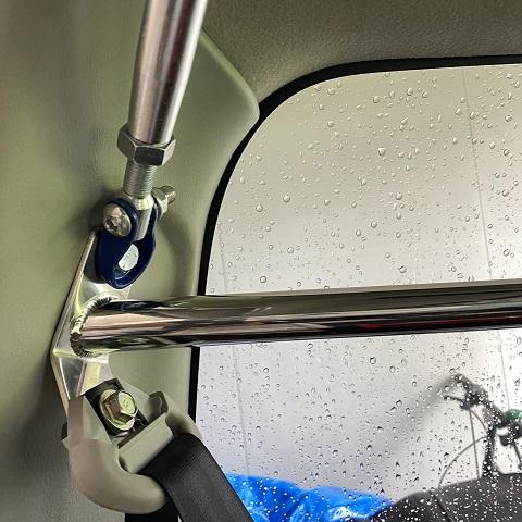 リア側取付け完了。ピラーバー(上側)が取り付けてある位置が本来のシートベルト固定場所です。