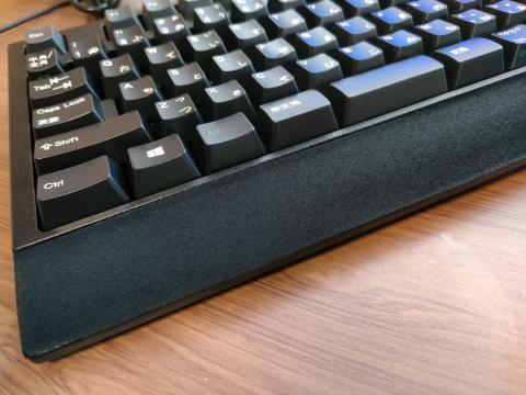 プリファードキーボードには、表面がゴム調のリストレストが付属します。本レビュー最初の画像に装着状態を載せていますが、長時間タイプで手のひらが熱を持ってくると、どうしても引っかかりが気になります。接合部分にはアルカンタラ調シートを採寸し貼り合わせました。掃除が少しばかり大変になりますが、さらさらした感じで手元が快適です。さらには見た目の質感もアップ。