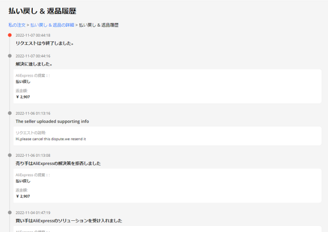 AliExpressに異議を申し立て、紛争に至ったわけです。