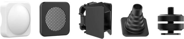 各種付属フィルター(シリコンソフター,ハニカムグリッド,4面遮光板,円形コンデンサーカップ,1/4ネジカメラ用シュー)