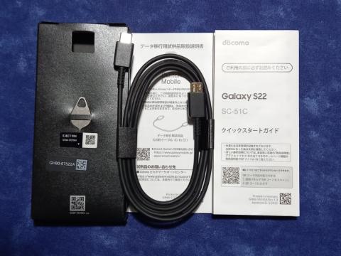 本体以外の付属品はデータ移行用USBケーブル(C to C)とSIM取り出しツール(いずれも試供品)で、後は、クイックスタートガイドとデータ移行ツール「Smart Swich mobile」の説明書だけと至ってシンプルです。