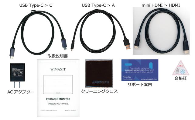 パッケージ内容は、フルHD 15.6インチモニター , モニターカバー兼スタンド , USB Type-C>Type-Cケーブル , USB Type-C>Type-Aケーブル , HDMI>miniHDMIケーブル , ACアダプター(USB Type-A) , 取扱説明書 , クリーニングクロス , サポート案内 , 検査合格証が入っていました。
