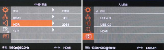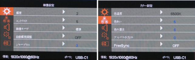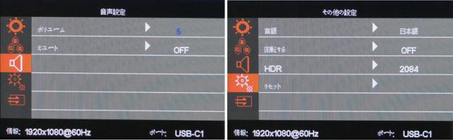カラー設定では、ブルーライトカットの設定やフリーシンクの設定、その他の設定では、HDRの設定も可能です。