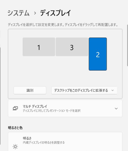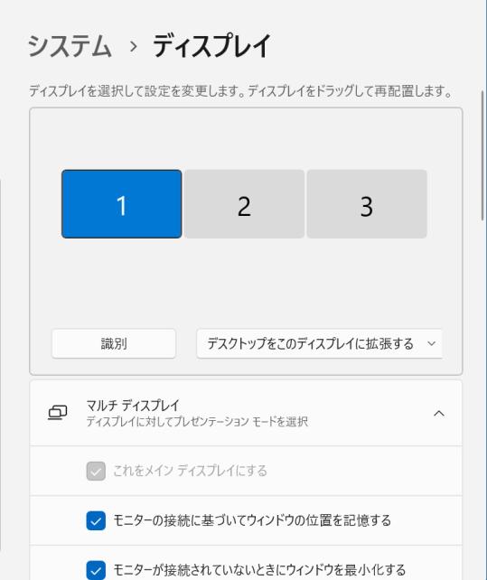 ノートPCには、HDMI出力も装備されているので、USB Type-C以外に、HDMIケーブルでも接続すると、PCでは3画面認識され、液晶表示自体は2枚なのですが、拡張モニターの入力を切り替えることで、3画面の制御を行うことが可能です。