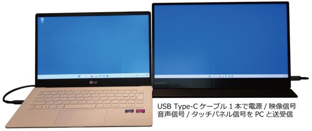 私の所有するノートPCでは、USB Type-C端子同士を付属ケーブルで接続することで、ノートPCの電源からUSB Type-C経由で電源がモニターへ供給され、PCの例えば拡張画面の信号と音声信号が供給され、更にタッチパネルを操作することで、PC内蔵画面上にあるマウスカーソルを、一瞬で拡張画面上に移動可能です。