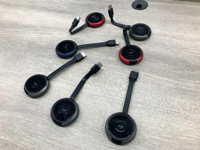 モニタ側に常時受信機を設置しておき、送信機は会議室のテーブルに放っておいて使いたい時だけさっと接続して使う、という運用ができるので迅速さが求められるビジネスシーンには合っています。