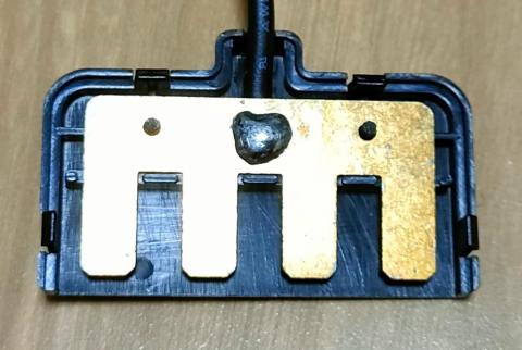 接続には下記のような250型の平型端子を必要とします。(この端子は金属の厚みがありすぎて普通には接続出来なかったです。マイナスドライバーでメス側の接続部の一部を持ち上げる感じで少し変形させました。)