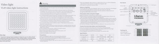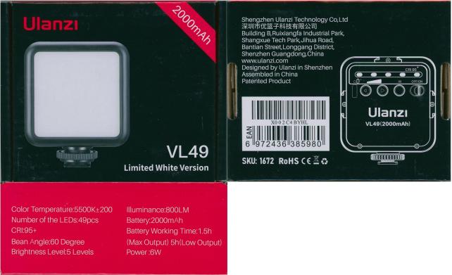 主な仕様は、色温度5,500ケルビン±200 , LED 49個 , 高演色 95+ , 照射角度60度 , 輝度調整5段階 , 明るさ 800ルーメン , バッテリは2,000mAhで、最大輝度で1.5時間,最低輝度で5時間照射可能であることと、消費電力6W であることが記載されています。