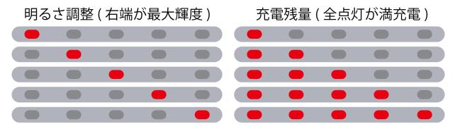 電源を入れると、デフォルトは光量表示で、インジケータ切替ボタンを押すとバッテリ残量表示に切り替わります。