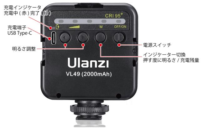 本体背面には、右から、電源スイッチ , インジケータ切り替えスイッチ , 光量大ボタン , 光量小ボタン , 充電用USB Type-C端子が並んでいて、その上部には、光量とバッテリ残量を示す5連のLEDと、充電中/充電完了を赤/緑で示すLEDが並んでいます。
