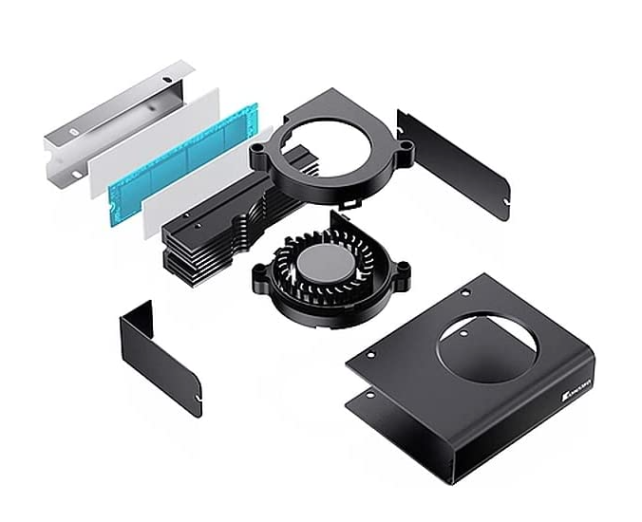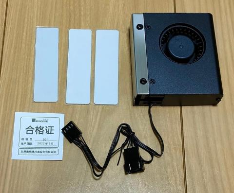 内容物(薄いサーマルパッドx1、厚いサーマルパッドx2、ヒートシンク+冷却ファン)