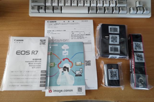 左から順番に「説明書」「保証書」「当社で写真教室やってるんで入りませんか?チラシ」「充電器」「バッテリー」「ネックストラップ」 が入っていました。