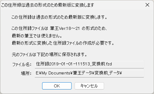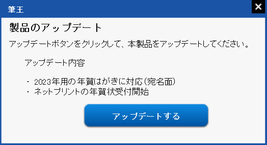 さて、宛名書きをしようと、昨年使った SOURCENEXT 筆王を起動すると、バージョンアップのお知らせが表示され、そのウィンドウを閉じると、筆王が起動しません。