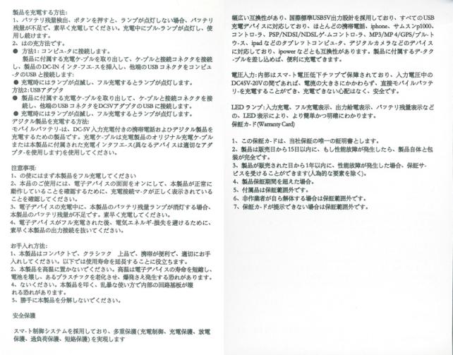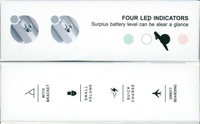 パッケージには、この他には、4つのLEDで充電状況が判ることや、航空機に持ち込める仕様であることが記載されています。