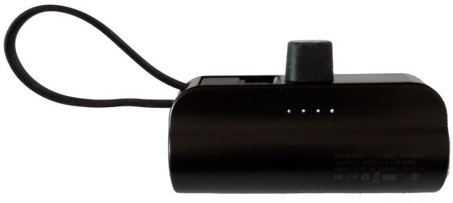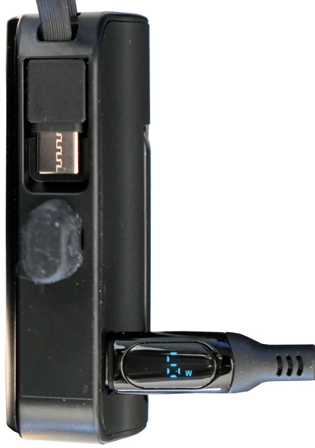 iPhone用のライトニング端子と共に、USB Type-Cケーブルが内蔵されていて、ストラップのようなものがUSBケーブルで、本体に収まっているUSB Type-C端子(オス)がを引っ張り出すと、10cm程度のケーブル長になります。