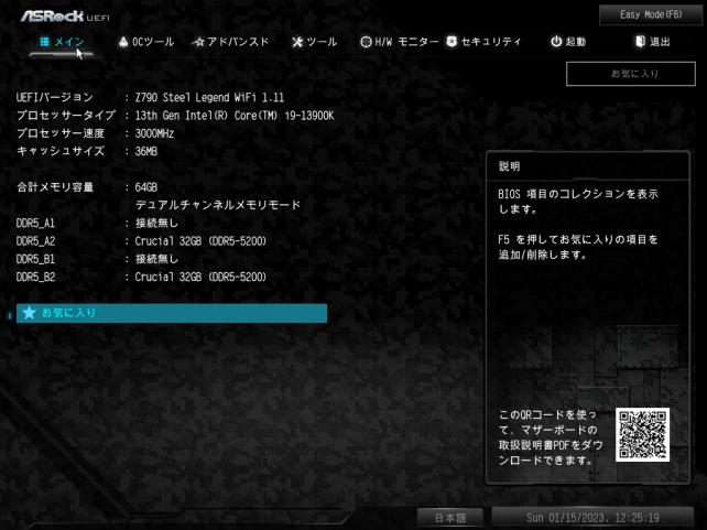 マザーボードに挿すと、デフォルトでは、DDR5-4400と認識されますが、XMPを有効にすると、無事DDR5-5200 32GB x2と認識されました。
