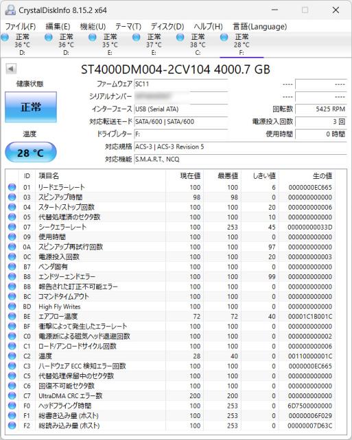 HDDだけは、変わっている可能性があるので、DiskInfo.で調べてみると、前回購入のHDDは、WesternDigital製でしたが、今回は、Seagate ST4000DM004という市販モデルでした。