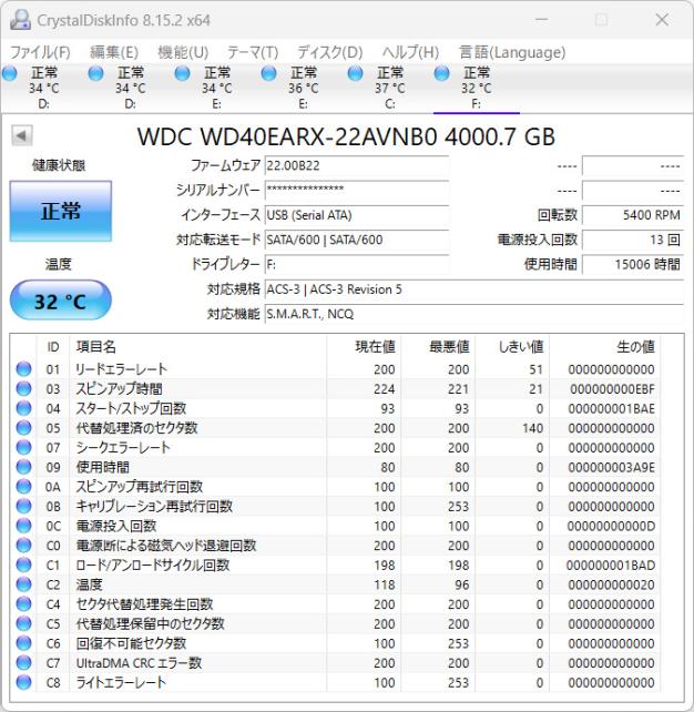 DiskInfoで見てみると、内蔵HDDは、WD製のWD40EARXという4TBのHDDの様です。
