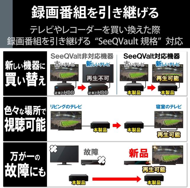 このSeaQVault対応HDDは、SeaQVault対応レコーダーやテレビに接続することで、異なったレコーダーやテレビで録画したコンテンツを再生することができます。